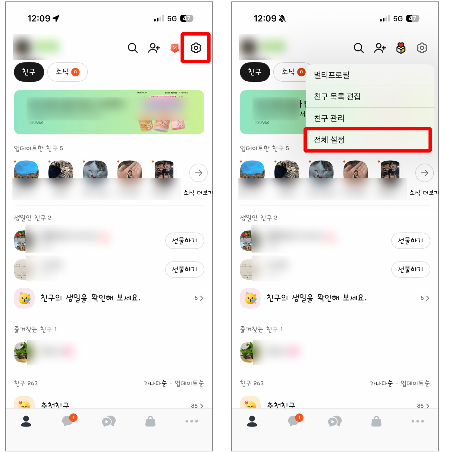 우측 상단 톱니바퀴(⚙️) → ‘전체 설정’으로 들어갑니다.
